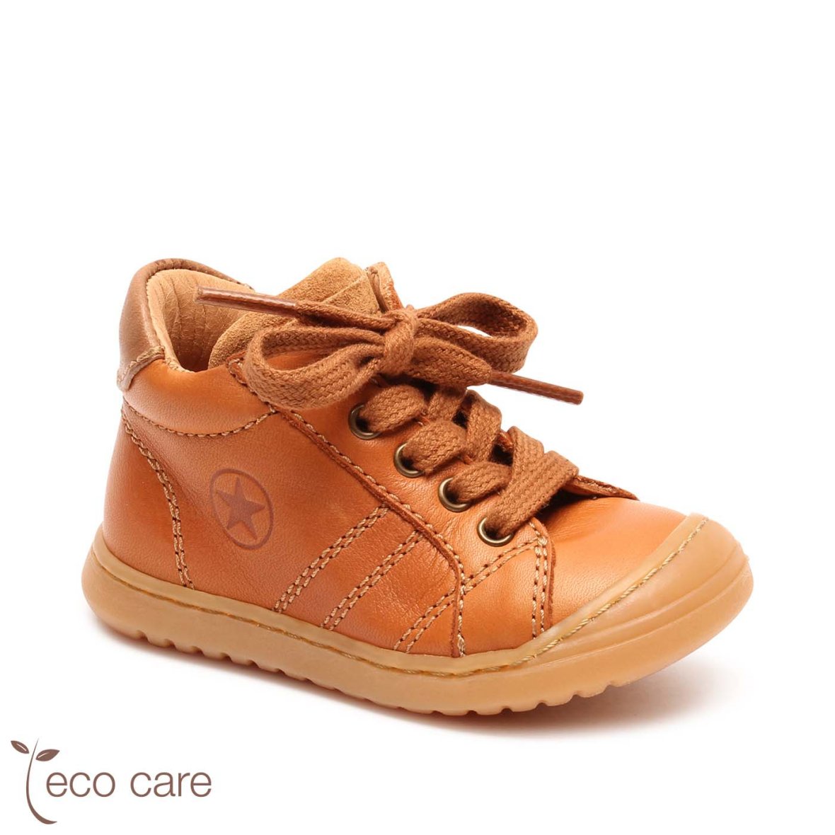 Chaussure premiers pas avec un contrefort haut et rigide au niveau du talon pour une bonne stabilité et un bon maintien. La chaussure est en cuir 100% naturel, ce qui permet au pied de respirer. La semelle antidérapante en gomme est souple et flexible. Les lacets réglables garantissent une forme optimale et naturelle.